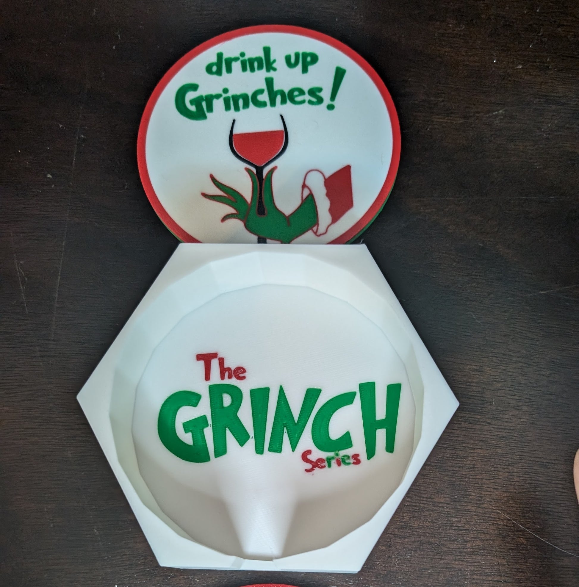 Add a little holiday Mischief to your drinkware with our "Drink Up Grinches" Coaster set! This set includes four high-quality coasters, each with a playful "Drink Up Grinches" design that is perfect for Grinch lovers and anyone looking to add a hint of humor to their holiday decor. Comes with a matching holder for easy storage. Ideal for hot or cold drinks, these coasters are durable, easy to clean, and protect any surface in style