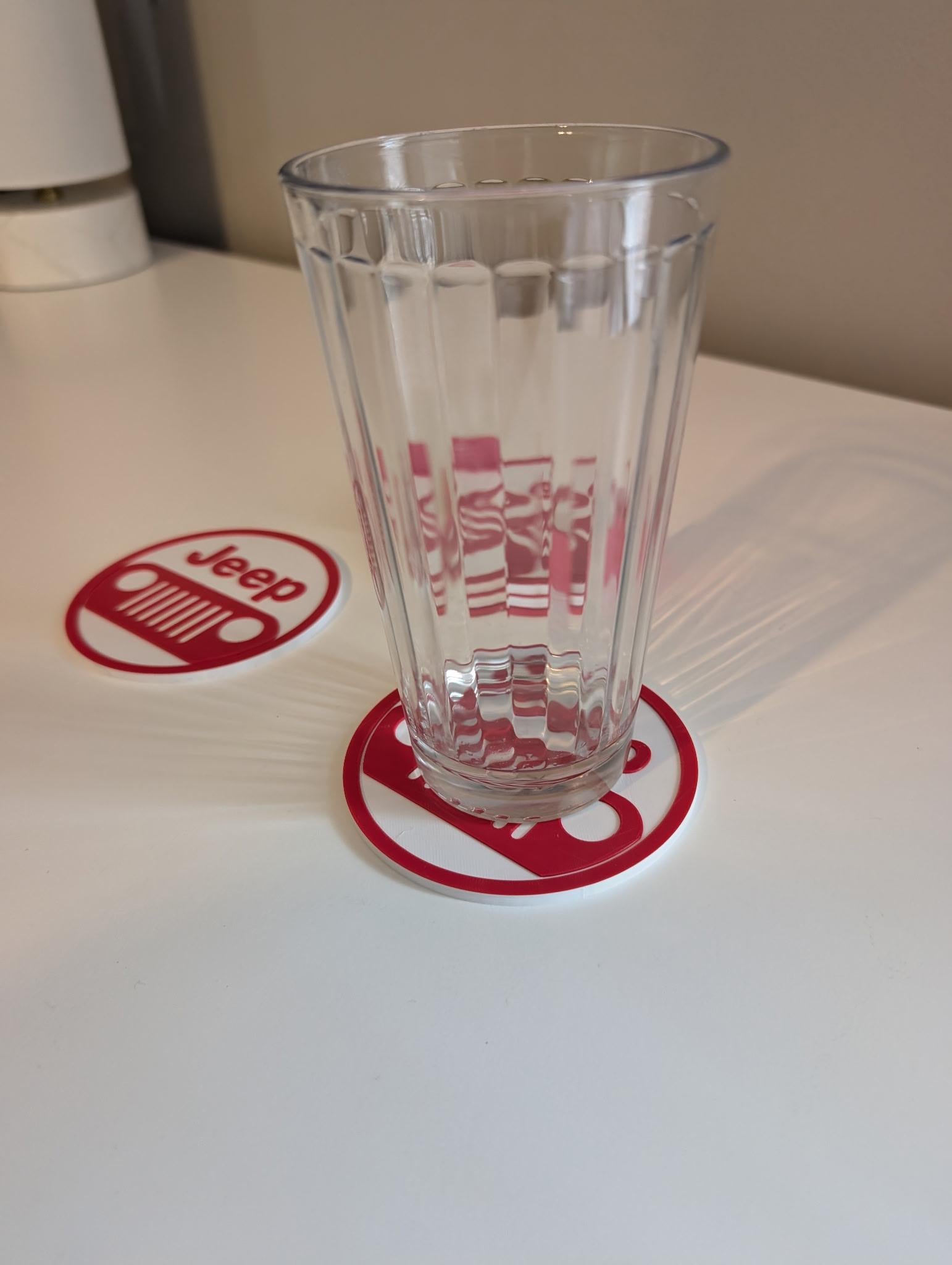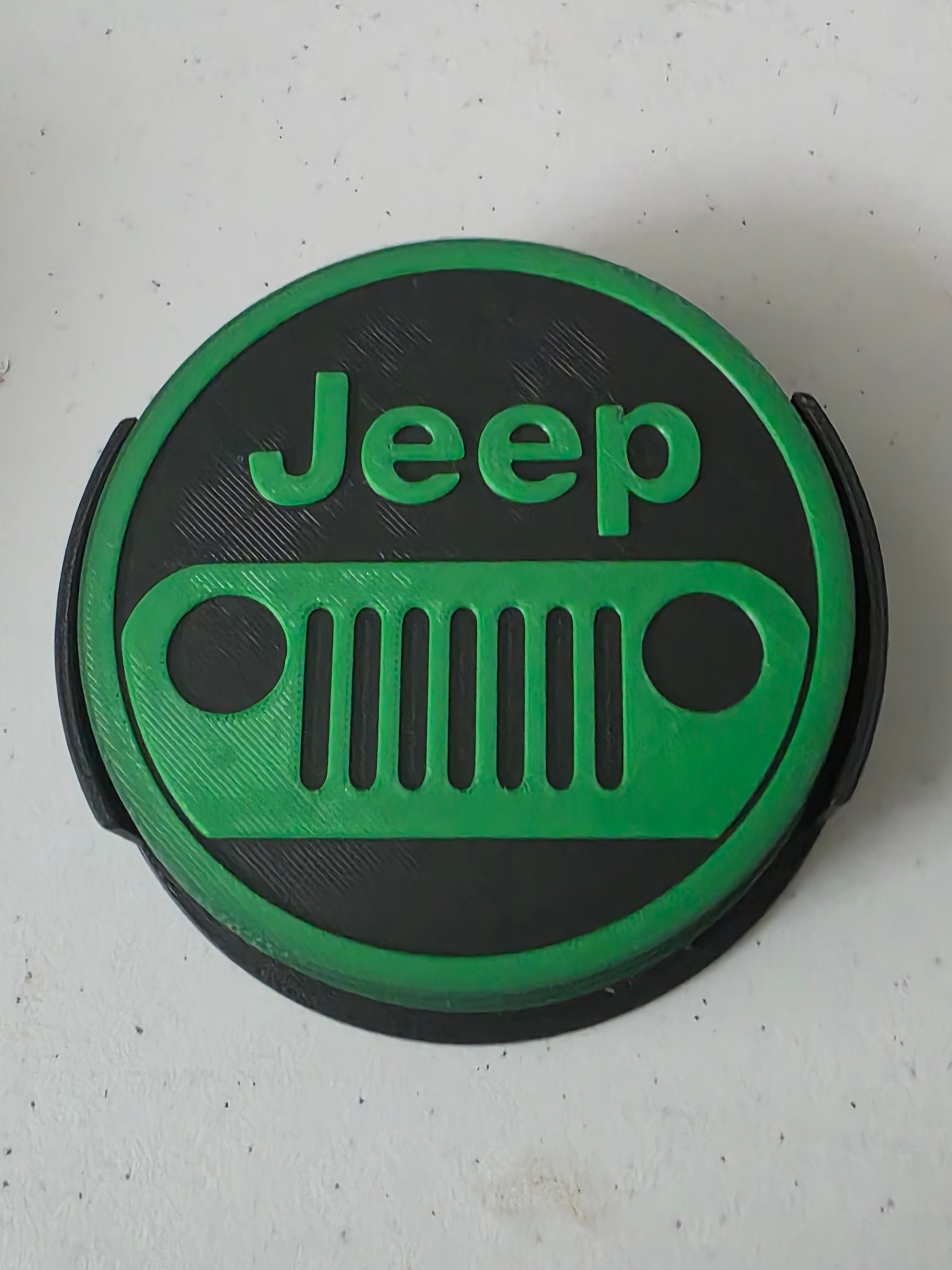 Set of 5 matching coasters Includes a sleek coaster holder for easy storage Iconic Jeep grill + "Jeep" text on each coaster Printed in durable, high-quality PLA Dual-color design – choose your custom color combo!
