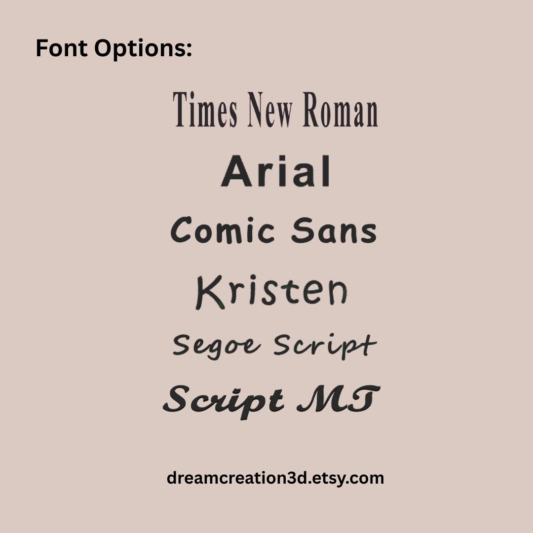 Please include your preferred font in the personalization section when placing your order. If no font is specified, we will use the default Arial font.