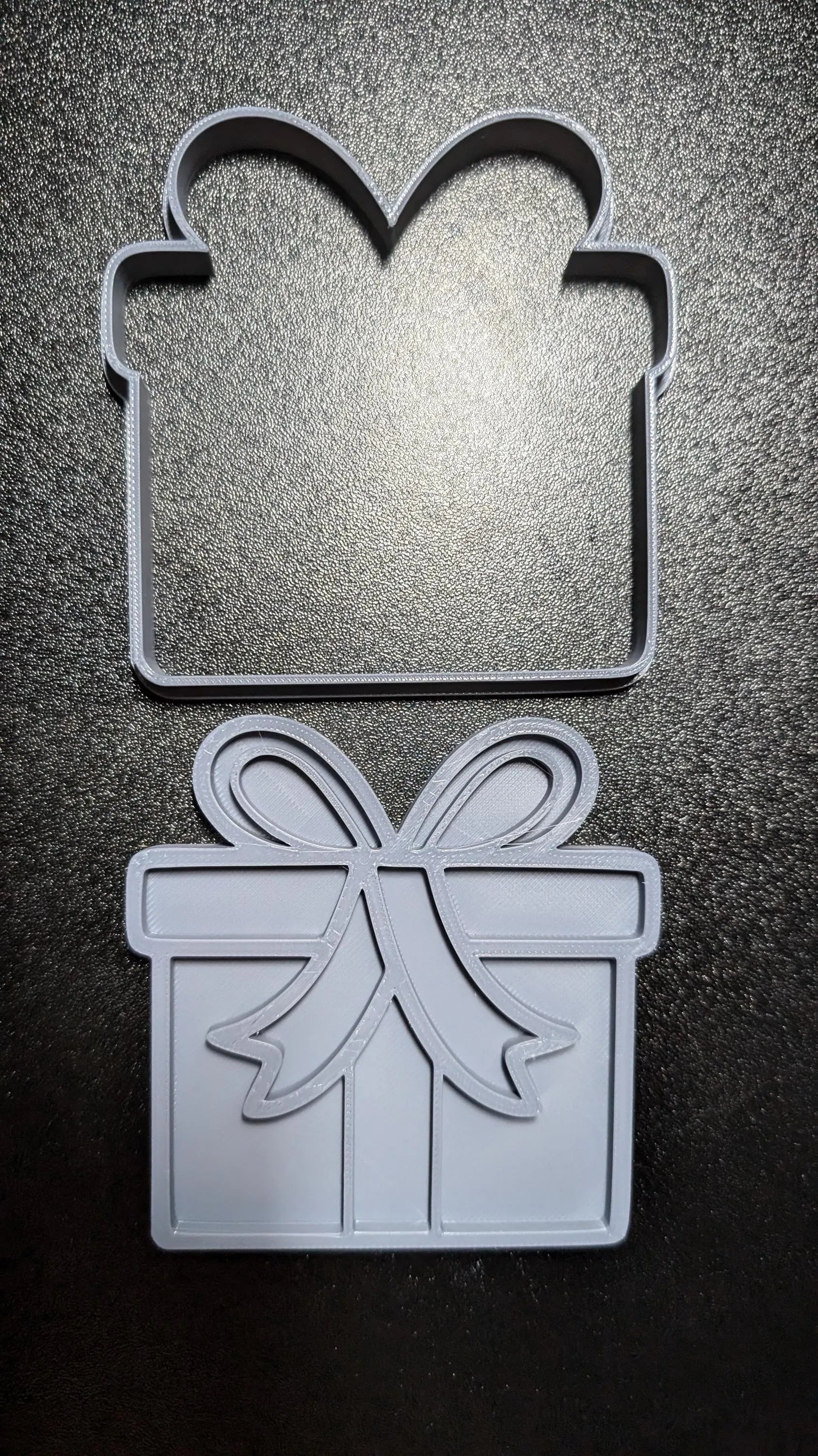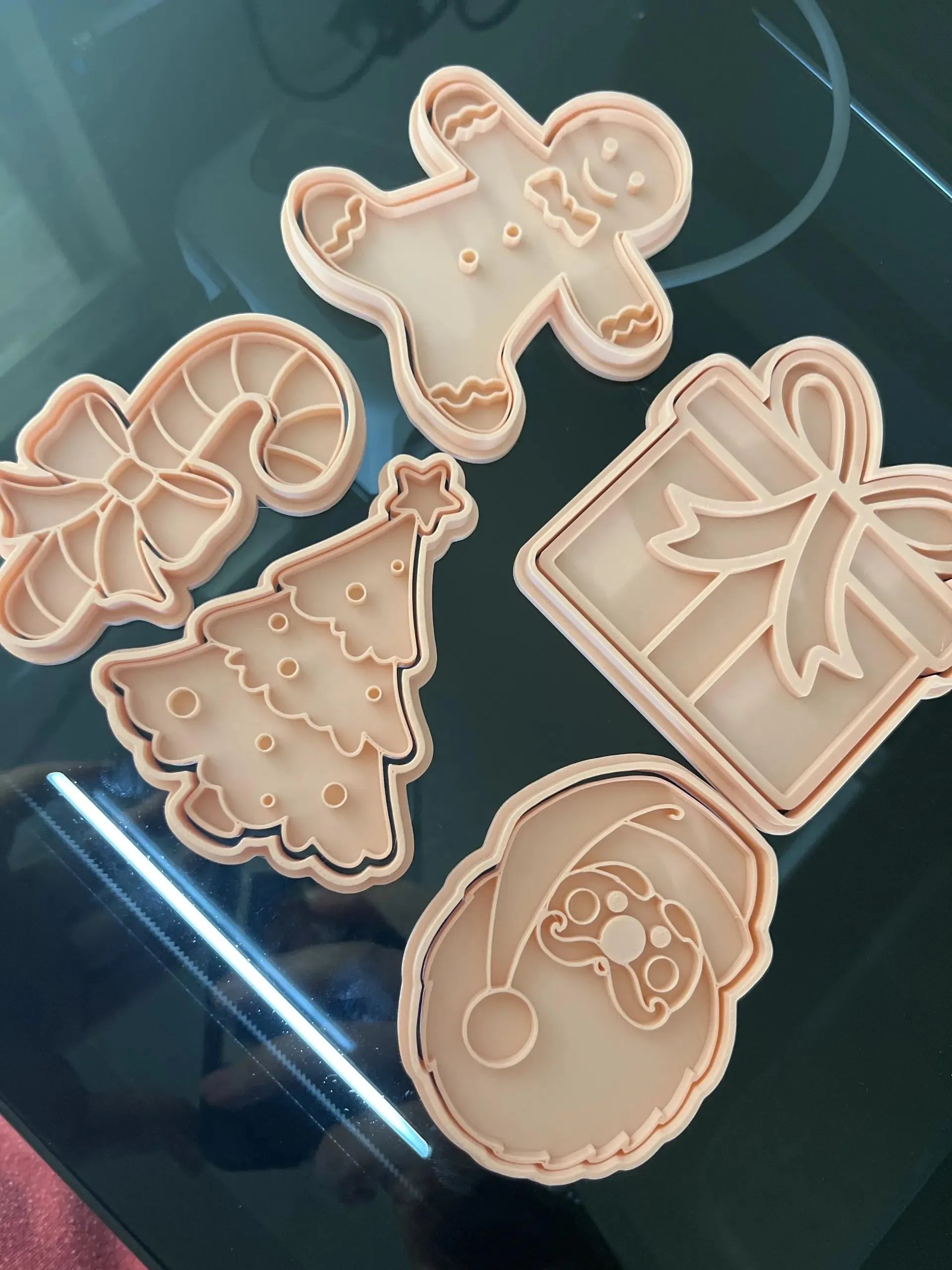 5 Christmas cookie cutters/Stamps. Comes 5 in a set including Santa, Christmas tree, Gingerbread man, Candy Cane, and Christmas present. Each cutter comes with an outline as well to total 10 cutters in all. All cutters are made with food grade PLA and will make for great Christmas memories or a lovely holiday present!
