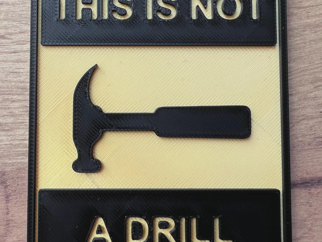 This is not a drill - Sign with Hammer – funny 3D printed wall decor – tool joke gift, garage sign, workshop humor, man cave decor