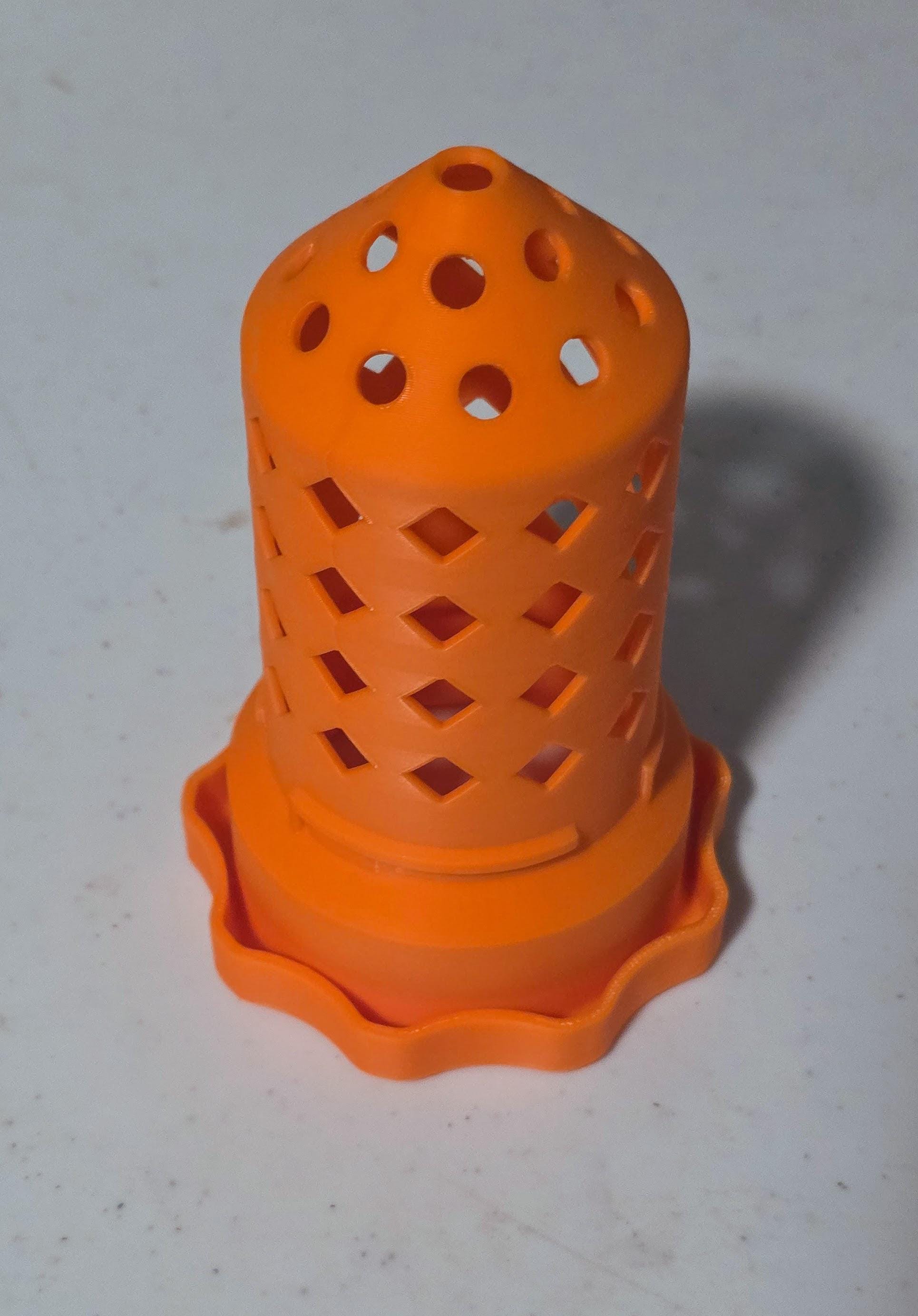 Tower Dimensions Base: 20 × 20 cm (8 × 8 inches) Tower Diameter (without pots): 15 cm (5.9 inches) Pot Diameter: 6 cm (2.4 inches) Height per Module: 13.5 cm (5.3 inches) Full Tower Height: 57 cm (22.5 inches) 🔧 Bottom Installation Instructions If you’re using the included bottom parts, follow these guidelines for proper fitting and durability: Clearance Hole: Cut a hole at 115 mm (4.527") diameter. If using a compass for exact measurements set your compass to 57.5 mm radius and scribe from the lid’s center. Most lids have a small molded mark in the center, which works perfectly for alignment. Drilling Bolt Holes: Use the top lid as a layout pattern to drill 12 clearance holes (.257" diameter — for 1/4-20 bolts, or drill for M6 bolts). Assembly: Place the bottom adapter plate under the lid. Sandwich the lid between adapter plates. Use 3/4" long stainless steel bolts with washers on top and bottom + a nut underneath. Stainless steel is highly recommended to prevent rust.